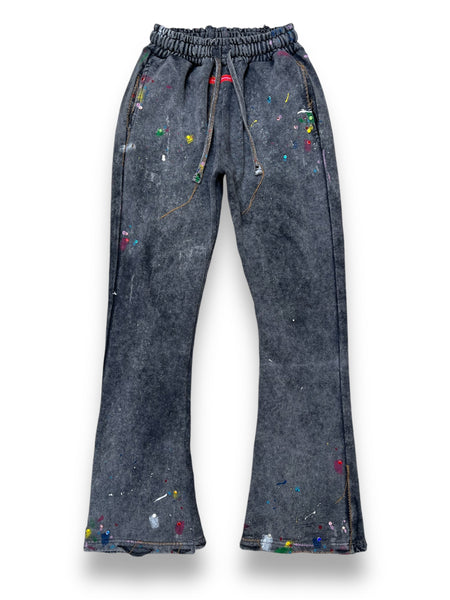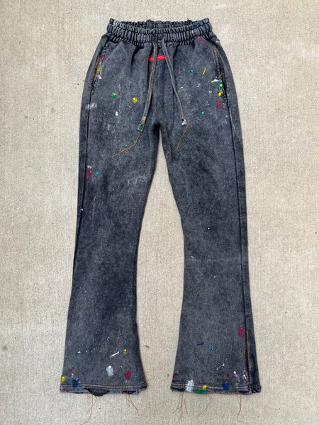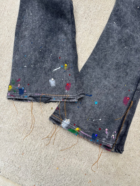 Hand Designed, Heavy Duty Flare Acid Wash Sweat Pants, Hand Painted, Hand Punched Rhinestones (No Glue), Random Zig-Zag Stitches & Distress Marks, Thick Elastic Waist Band Featuring 4 Total Pockets